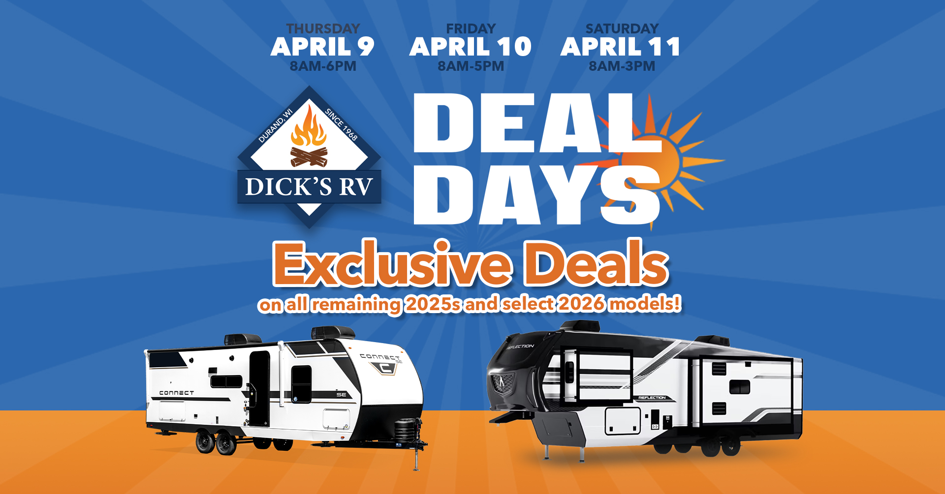 Suns Out, Sales ON! Dick’s RV Deal Days are back April 9th through 11th only! Take advantage of exclusive deals on all remaining 2025s and select 2026 models, and you can enter to win the Ultimate Outdoor Cooking Bundle, including a Blackstone Griddle, Ninja Cooler, and Stanley Wildfire Cookset.