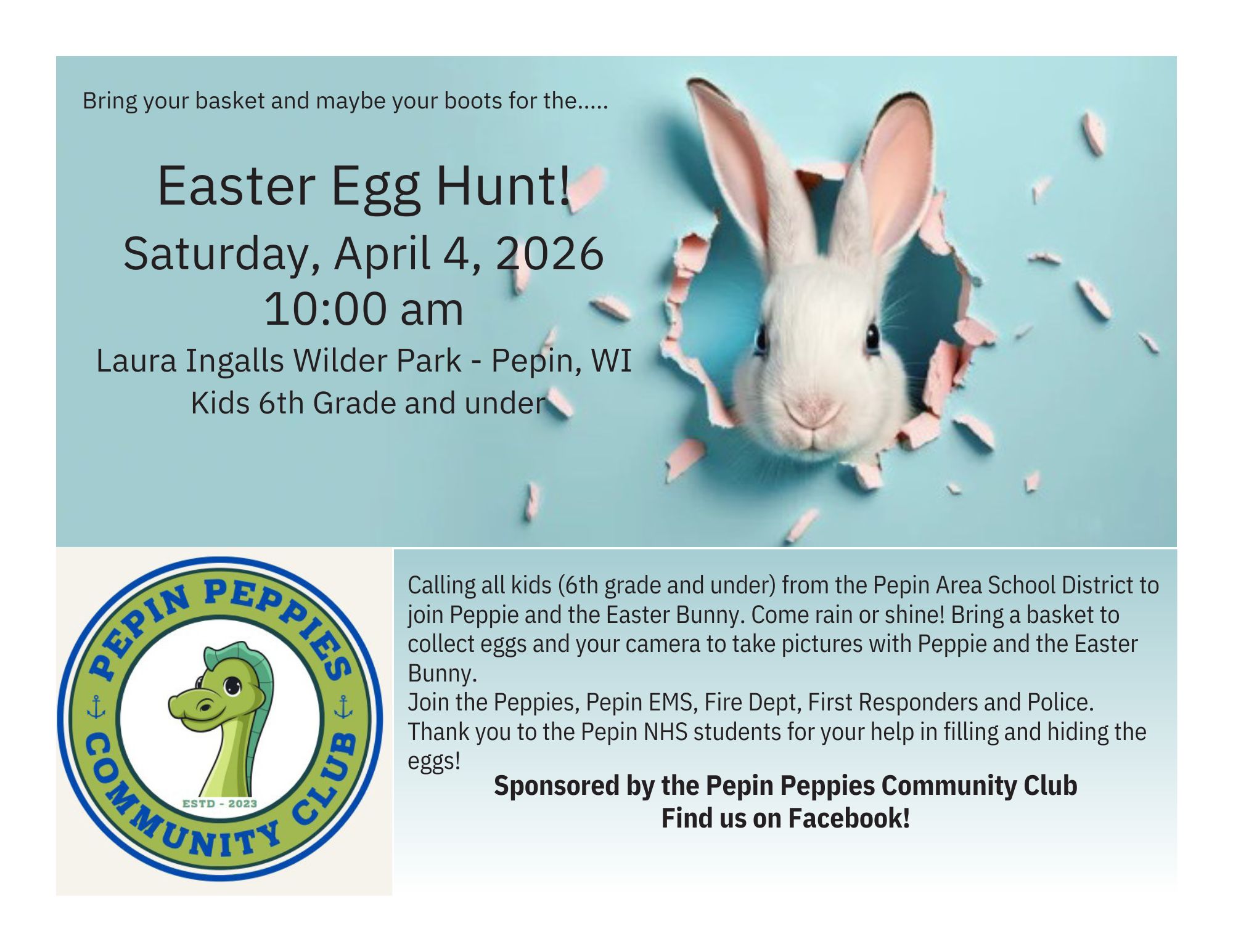 Calling all kids (6th grade and under) from the Pepin Area School District to join Peppie and the Easter Bunny. Come rain or shine! Bring a basket to collect eggs and your camera to take pictures with Peppie and the Easter Bunny.