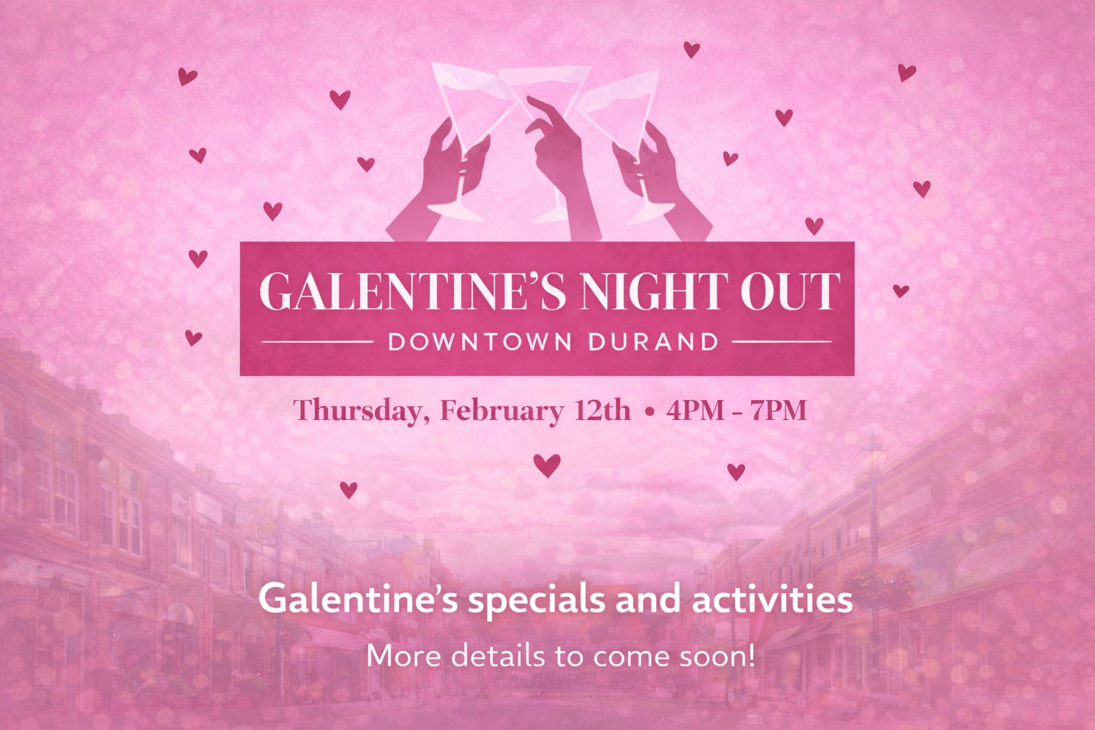 Local Main Street businesses are collaborating to make this a special evening just for Galentineโ€™s. You will have a chance at a raffle basket at each location with each $25 spent!!