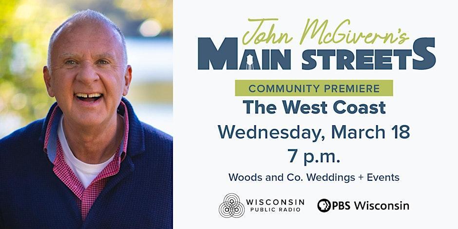 Join PBS Wisconsin and WPR for a free community screening of “The West Coast” episode of the hit public television show “John McGivern’s Main Streets!” Be among the first to see it on March 18 at 7 p.m. at Woods