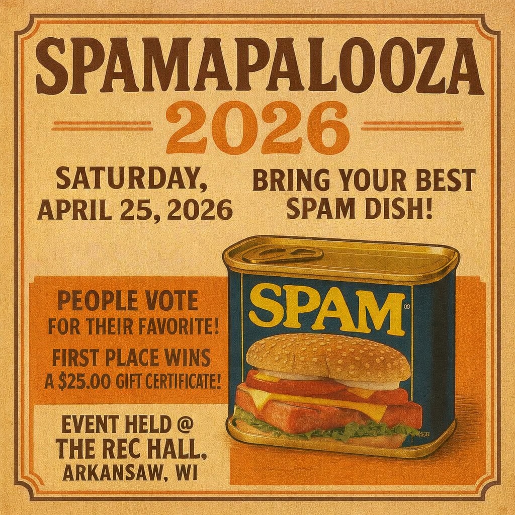 Spamapalooza Bring your best Spam dish! Crowd vote for favorite dish. $25 gift certificate to winner! + Add to Google Calendar + iCal / Outlook export 00 days 00 hours 00 minutes 00 seconds Date Apr 25 2026 Time 5:00 pm - 9:00 pm Location The Rec Hall N6219 Co Highway North, Arkansaw, WI 54721 Category Arkansaw Community Competition Dining Entertainment Share this event Events Dine Bar & Grill Deli & Fast Food Desserts & Sweets Restaurants & Cafés Local Waters Stay Bed & Breakfast Camping Vacation Rentals Motels Visit Art Farmer’s Market & Agritourism Things to Do Museums Snowmobile Trails Craft Beverages Shopping Outdoors Search for: